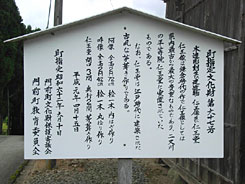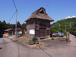 After leaving Anamizu and heading toward Wajima, the road divides in Omata. Then, after turning left toward Monzen we come to the Taira bus stop near Futamatagawa. Just after the bus stop we then turn right and a small, old reed-thatched building comes into view over to the right. As we approach the building we find that there are a number of large tree stumps around it. Judging by the diameter of these stumps the trees must have been of a considerable height. With the passing years, they grew tall and in 2002 they were felled for fear that they might blow down.