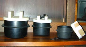 宮さんのお勧めは飯釜。鉄釜で炊いたおこげの美味しさは癖になるよ、と。2合炊き(15000円)から、3合(18000円)、5合(23000円)1升炊き(45000円)までそろっている。御飯を炊くだけでなく、シチューや野菜スープなど、一器多用に使えそうだ。