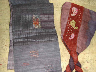 それは、お太鼓と前の部分だけがパッチしてあるのではなく、5m余の帯全体が繋ぎ合わされた絹の小片からできています。異なる階調の紫で染め分けられた部分、グレーの濃淡に深い紅が並べられた部分、ヨモギ色やコバルトブルーの深い色がアクセントとなっている部分、という具合に、大胆な色が調和をもって並べられています。