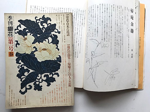 季刊「銀花」創刊号の表紙と秦さん監修による特集「現代の良寛 帰庵さんの人と芸術」の中から。
