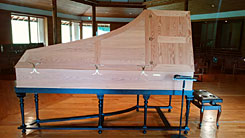 さて、2018年春、スヴァトスラフ・リヒテル没後20年を期して、八ヶ岳山麓の樹齢100年のカラマツを使ったチェンバロが、国内屈指のチェンバロ制作者久保田 彰氏によって完成しました。ヨーロッパバロック音楽を彩るチェンバロは、金色に輝き優雅な装飾で飾られた楽器との印象があるので、塗装を施さず白木のままという意匠にまず驚きました。カラマツの美しい木目を生かしたサイド、蓋の内側はフランスのアトリエに注文したという金箔と枇杷の花のモチーフの装飾。上品で優雅な雰囲気を醸し出しています。チェンバロは繊細な楽器で、温度湿度に敏感といわれていますが、微妙な調整は、演奏者自身がするそうです。